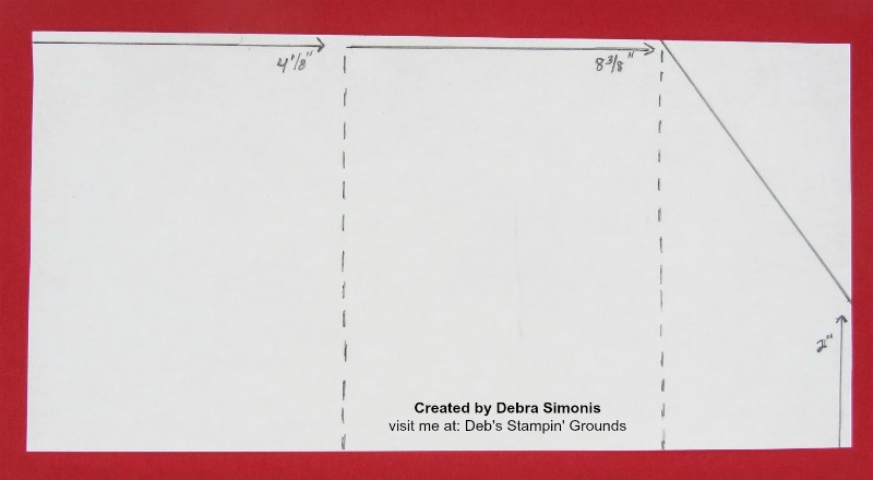 Below is a diagram of how the card base was cut. Start with a piece of cardstock that is 5-1/2 x 11″. Score at 4-1/8″ and 8-3/8″. Cut right side of cardstock as shown.