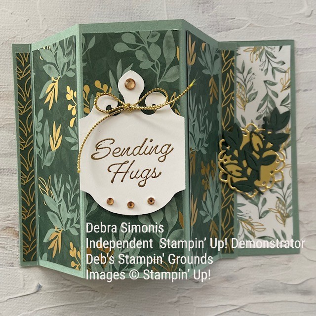 Stampin Up Eden’s Garden stamp set Ever Eden DSP Elegant Tag Punch heat embossing bay window fun fold card sending hugs card opened up – Debra SImonis Stampinup