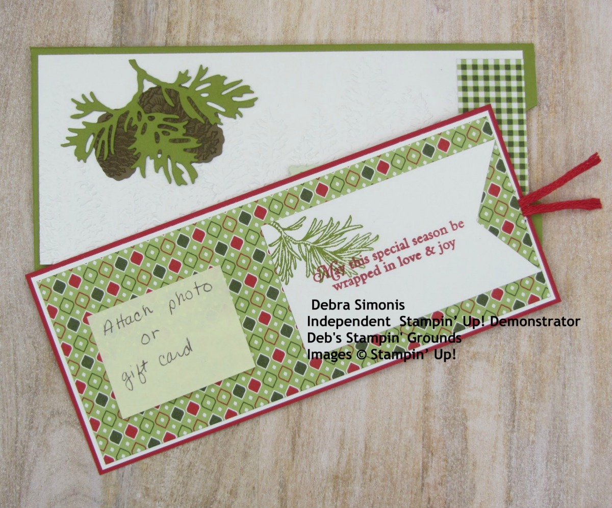 Stampin Up Peaceful Boughs Beautiful Boughs Dies Evergreen Forest Embossing Folder Banner Triple Punch Christmas Card with photo or gift card – Debra Simonis Stampinup